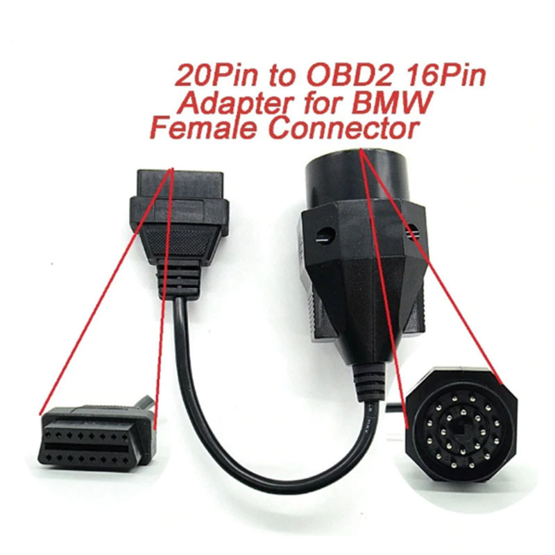 Перехідник OBD2 на BMW 20 pin для під’єднання діагностичних сканерів до автомобілів зі старим діагностичним роз’ємом. Слугує як перехідник з ОБД2 16-пін на BMW 20-пін. Сумісний із більшістю автосканерів.
